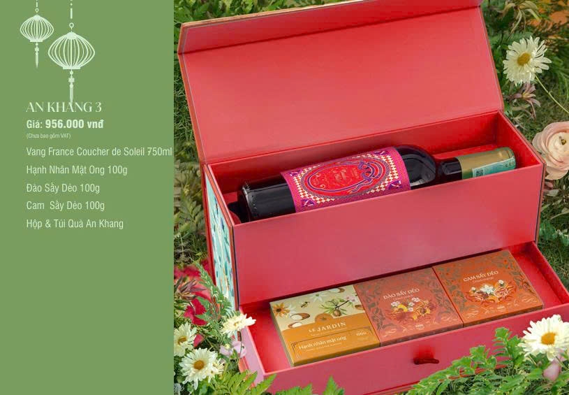 Hộp Quà Tết An Khang 3 sở hữu diện mạo sang trọng với rượu vang cao cấp cùng các loại hạt & trái cây sấy tuyển chọn. Đây là món quà Tết mang thông điệp thịnh vượng, phù hợp tặng đối tác lớn và khách hàng quan trọng.