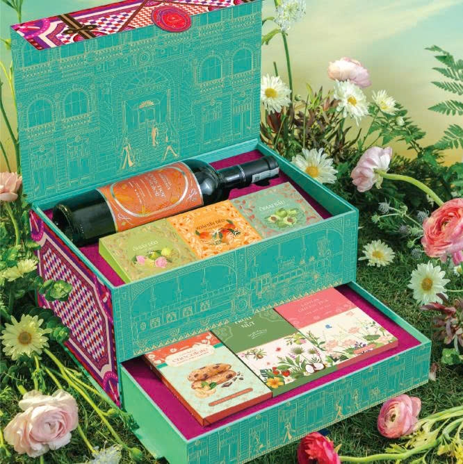 Bộ Hộp Quà Tết Du Xuân mang phong cách thanh lịch – sang trọng, lấy cảm hứng từ hành trình du xuân rộn ràng ngày Tết. Các hộp được thiết kế cấu trúc ngăn kéo tiện dụng, phối hợp màu xanh – hồng đầy sức sống, tượng trưng cho may mắn, tài lộc và khởi đầu hạnh phúc.